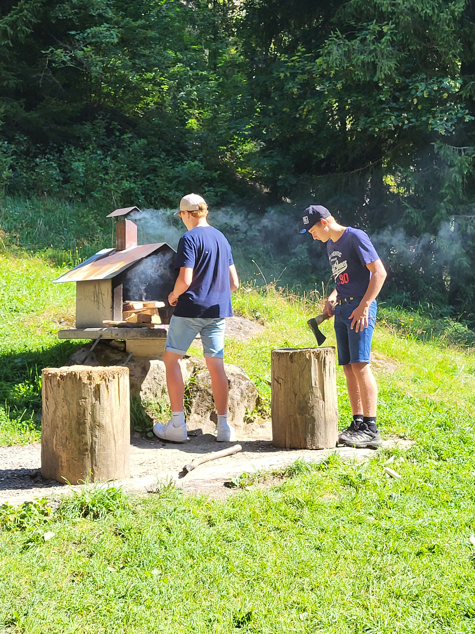 Vom Montagnachmittag bis am Donnerstagnachmittag fanden verschiedene Ateliers statt. Da wurden leckere Grissini gebacken, Waldspiele gemacht, erneuerbare Energiequellen kennengelernt und ein kleines Wasserkraftwerk zusammengebaut, Lieblingsplätze entdeckt, Kohlebilder gemalt, auf einem Rundweg Rätsel in Englisch gelöst, das Kneippen erlernt und sich sportlich betätigt.