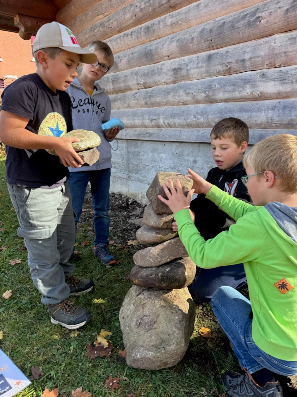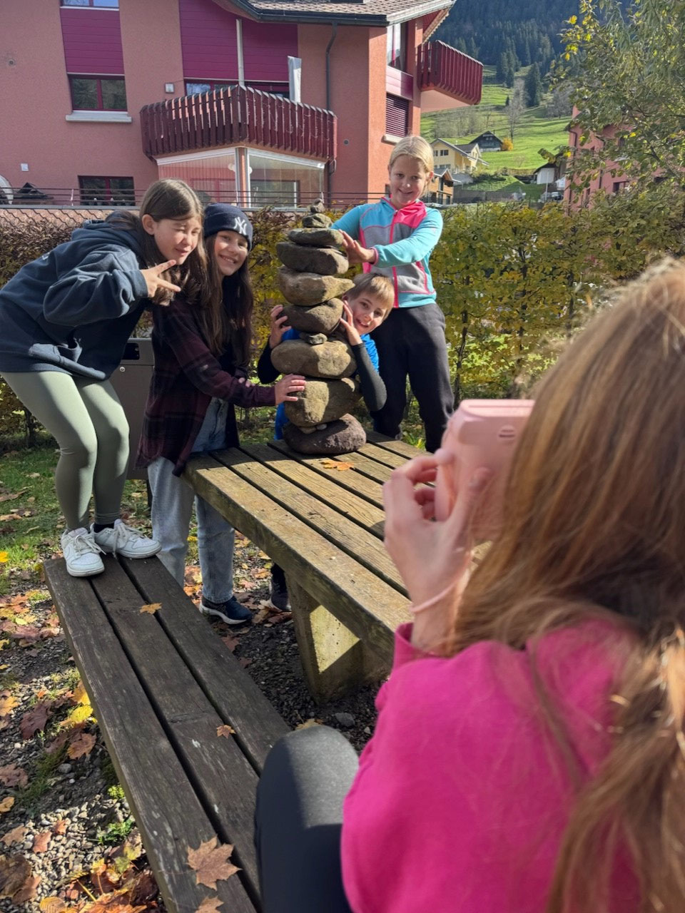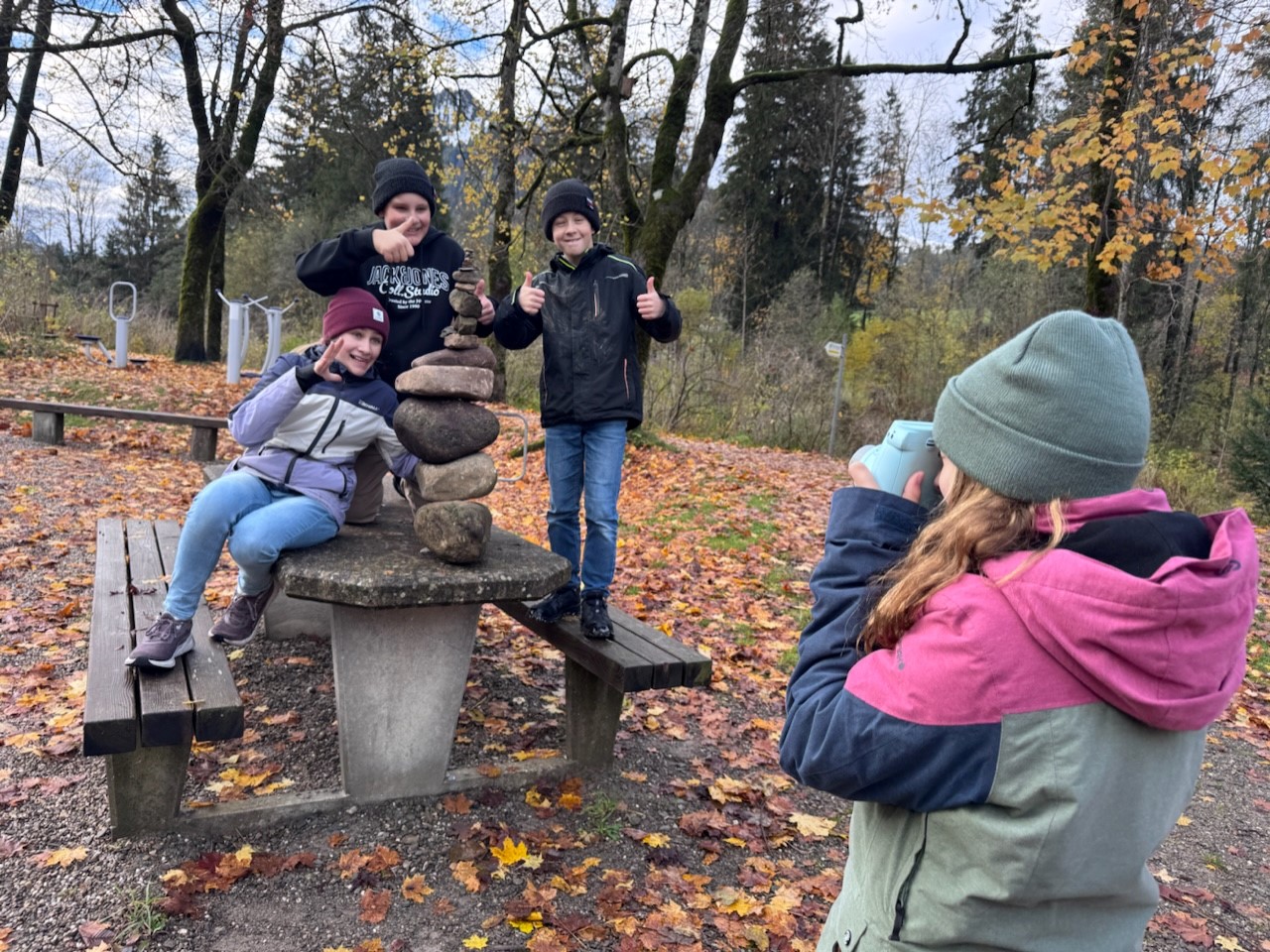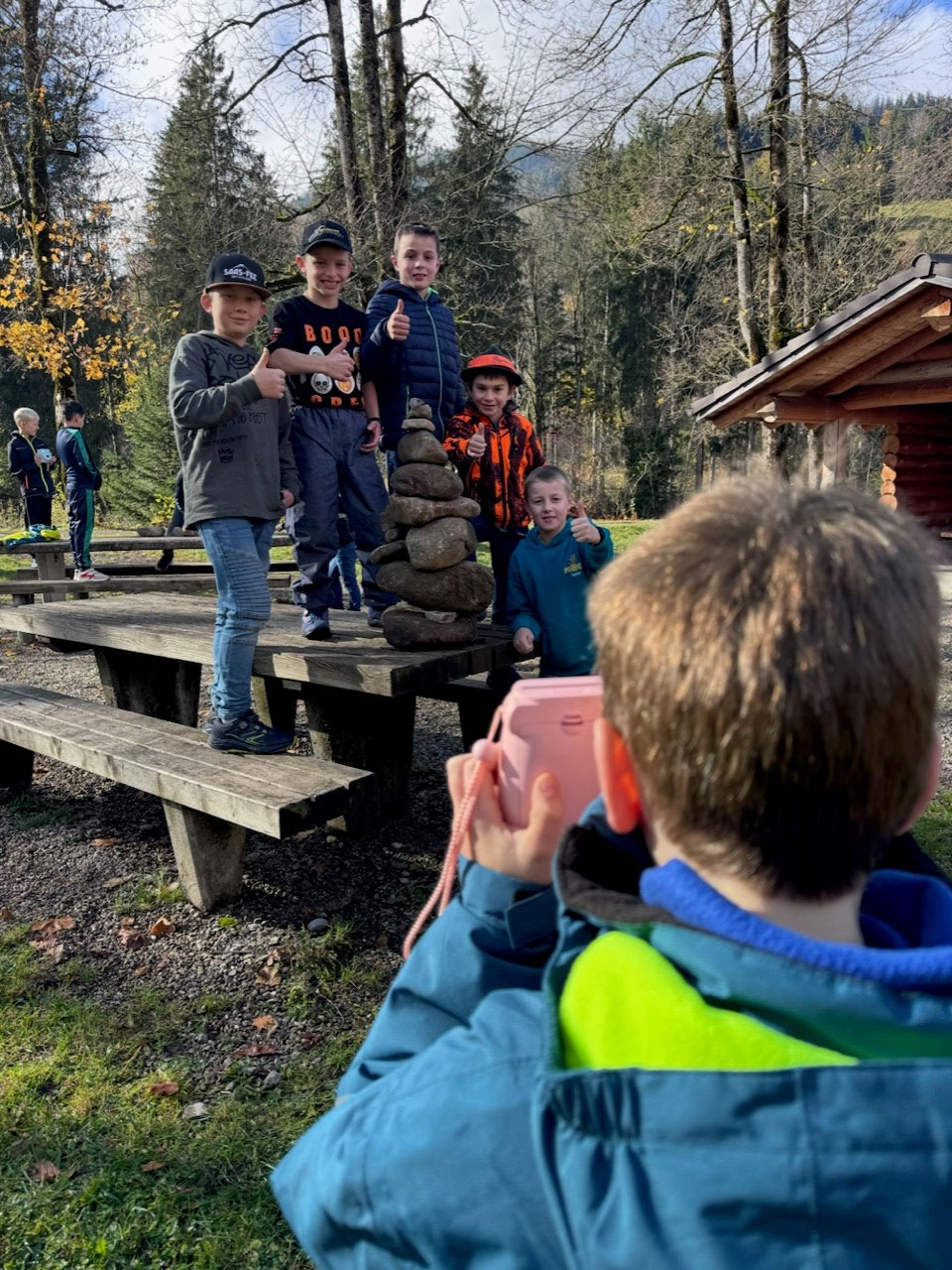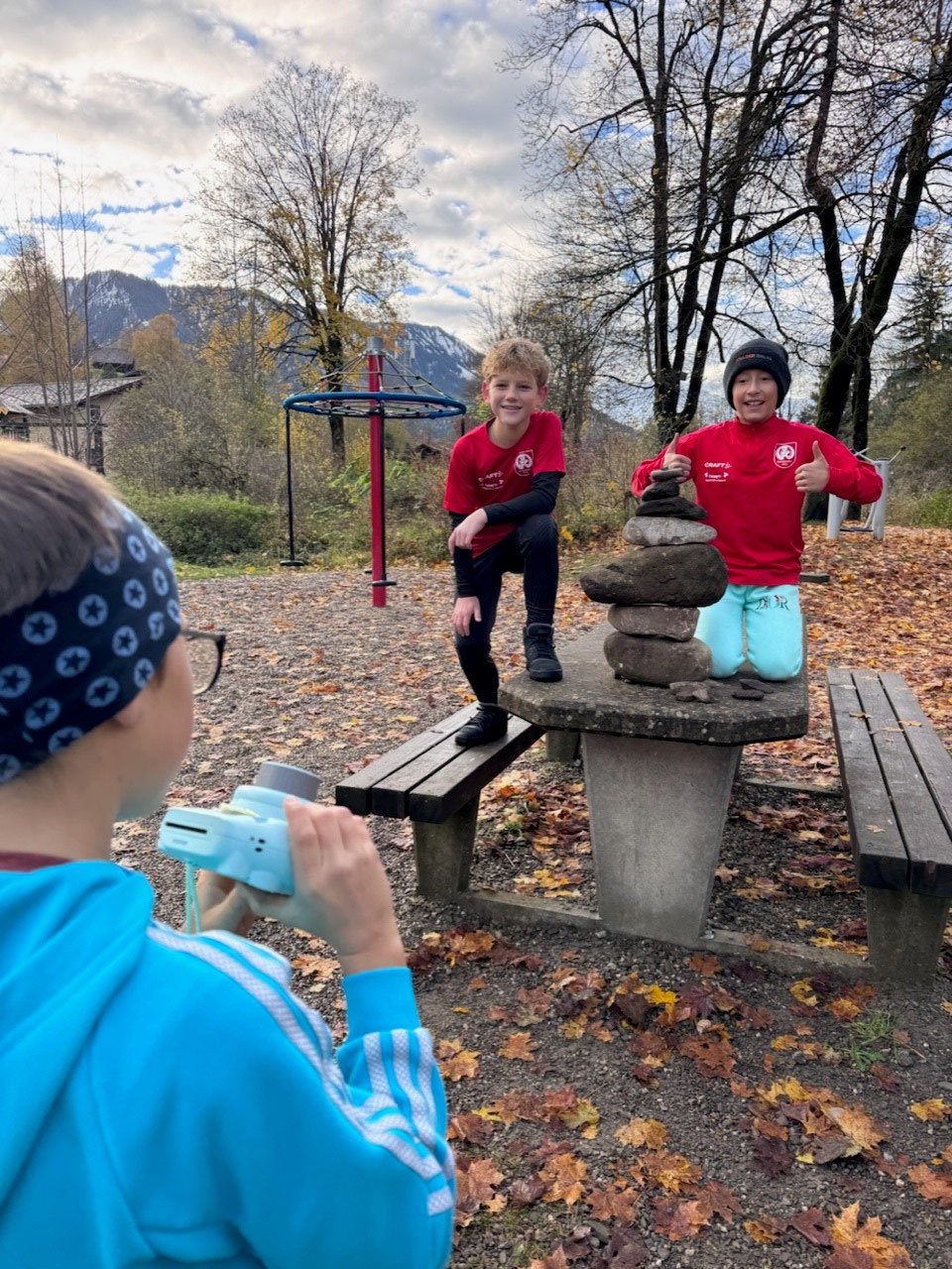 Kürzlich machten sich die Schülerinnen und Schüler der 3./4. und 5./6. Klasse im Rahmen des Turnunterrichts auf zu einer besonderen Herbstaktion: einer Foto-Challenge im Freien. Ausgestattet mit einer Sofortbildkamera ging es diesmal nicht darum, wer am schnellsten ist, sondern wer die kreativsten Ideen umsetzen kann. Beim Steinmandli-Bauen, Wegweiser-Suchen oder Turnen an der Reckstange entstanden originelle Motive und viele lustige Momente. So kann Sportunterricht im Freien aussehen – mit Bewegung, Kreativität und jeder Menge Spass!