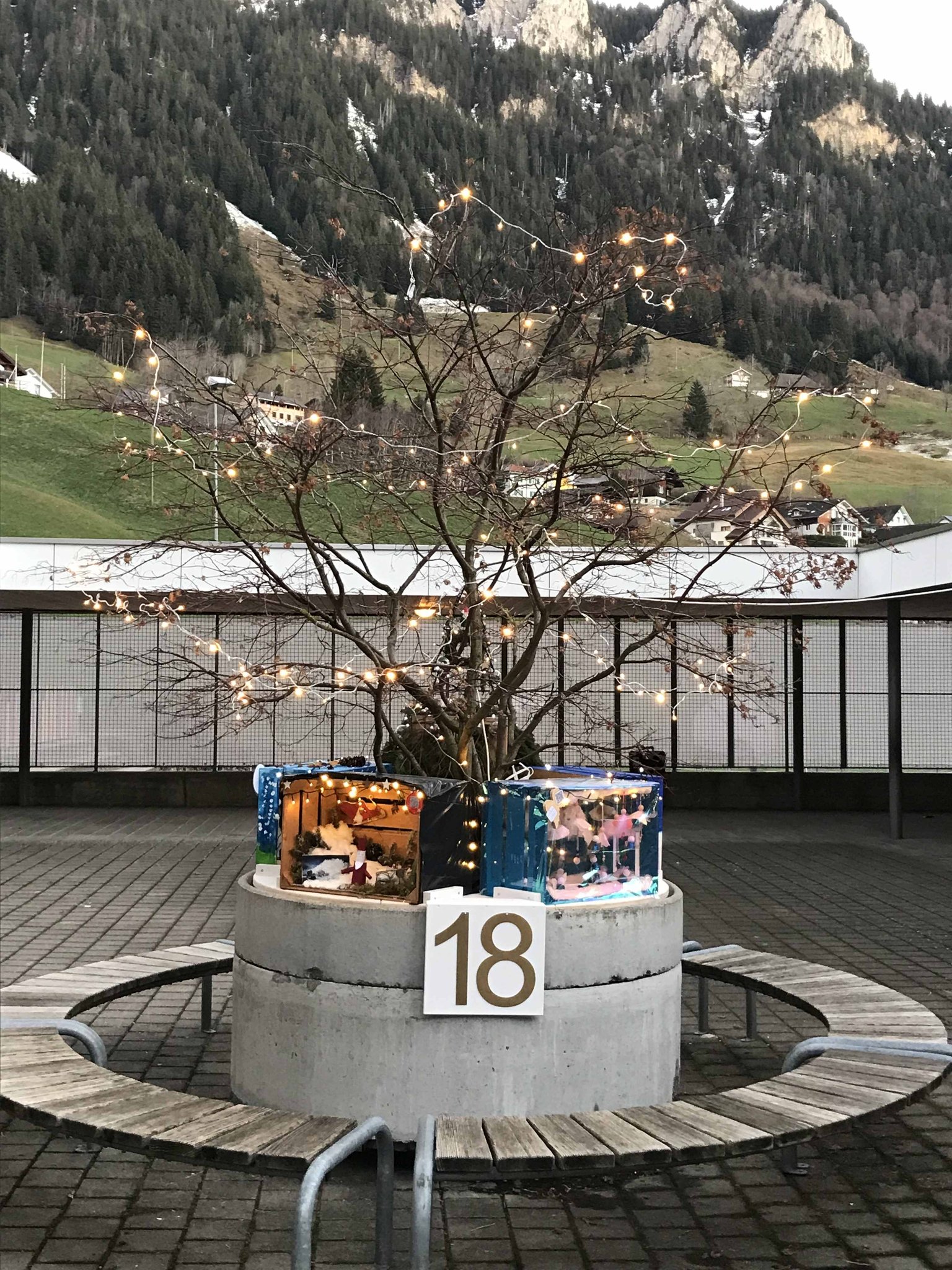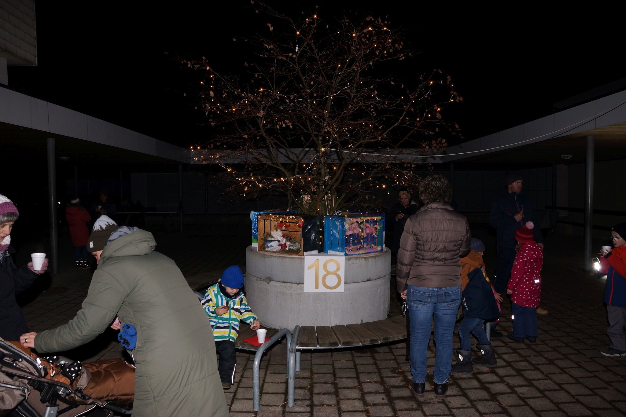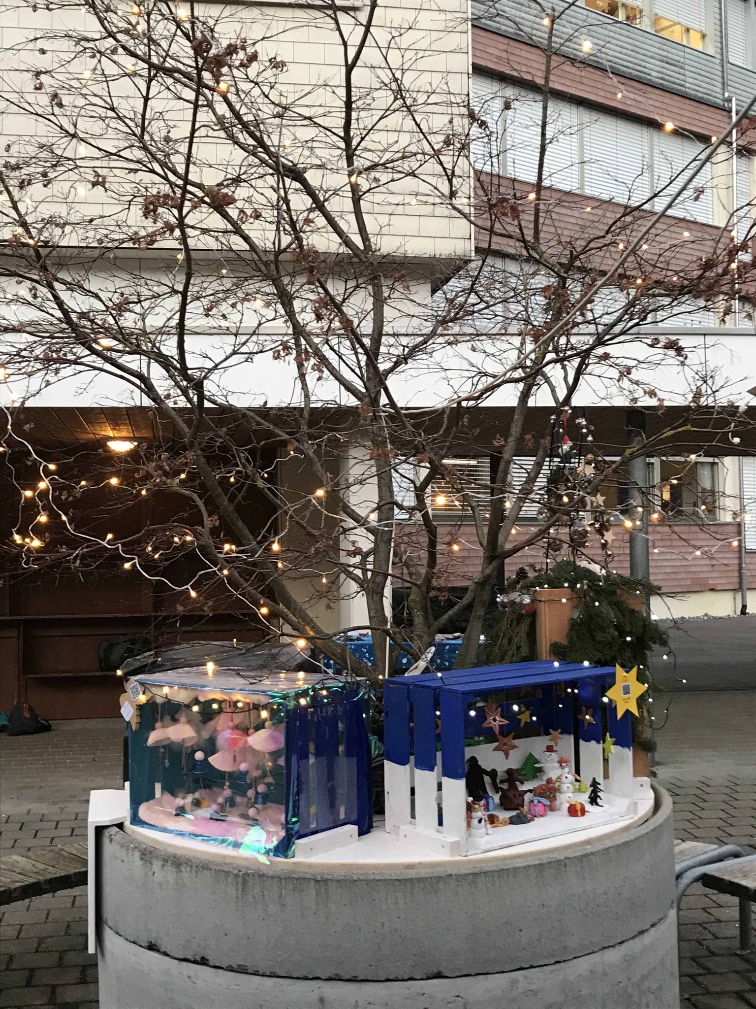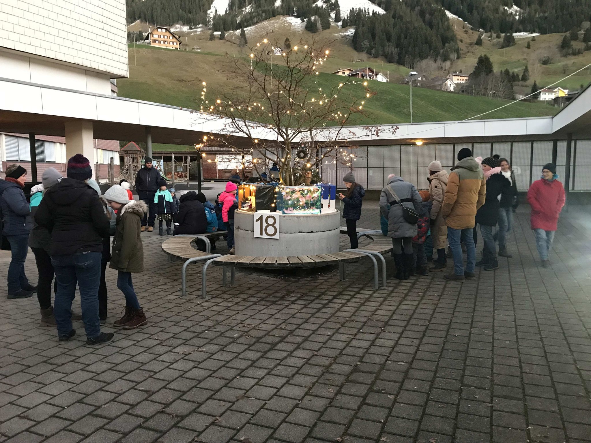 Am Montag, 18. Dezember 2023, durften wir in der Pausenhalle unser Weihnachtsfenster, resp. die Weihnachtsinstallation präsentieren. Die Gotte-/Göttiklassen hatten je eine Harasse weihnachtlich gestaltet, welche auf dem Sockel des Baumes in der Pausenhalle installiert und mit Beleuchtung versehen wurden. Zahlreiche Gäste besuchten die Eröffnung und konnten auch die gelungenen Darbietungen der Tanzgruppe von sieben Mädchen aus den 5./6. Klassen sowie der 1. und 2. ISS. Das Elternforum war für die Verpflegung mit Punch, Glühwein und Kuchen besorgt.