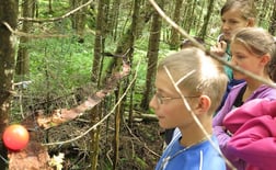 Eine Murmelbahn bauen: 5 Meter lang, eine Links- und eine Rechtskurve. Als Material darf nur verwendet werden, was im Wald am Boden liegt. Als Werkzeug sind nur ein Sackmesser und Paketschnur zugelassen.